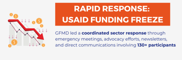 In January 2025, GFMD mobilised its members to share intelligence and data following the suspension of USAID funding. GFMD led a coordinated sector response through emergency meetings, advocacy efforts, newsletters, and direct communications involving more than 130 participants.
